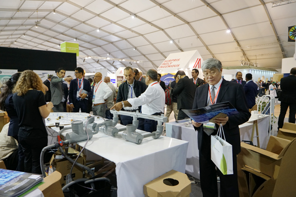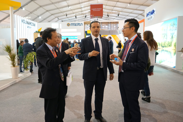 ??? 11月8日上午,在摩中商會、摩洛哥外貿(mào)銀行、香港匯盛資本等機(jī)構(gòu)負(fù)責(zé)人的陪同下,紀(jì)勤應(yīng)總經(jīng)理一行參觀了聯(lián)合氣候大會主展館。展會現(xiàn)場來自世界各地節(jié)能環(huán)保產(chǎn)業(yè)技術(shù)展示、部分獨具匠心的展臺設(shè)計展現(xiàn)出的世界各國實現(xiàn)綠色循環(huán)低碳發(fā)展,推進(jìn)清潔能源、可再生資源,應(yīng)對氣候變化、追求美好未來的決心等給考察團(tuán)一行留下了深刻的印象。